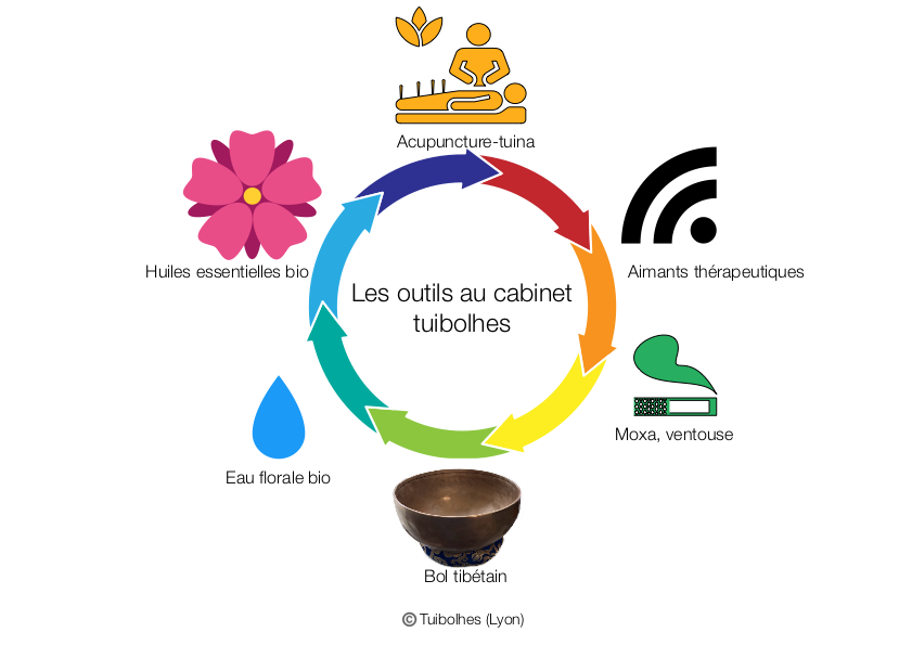 La médecine traditionnelle chinoise (MTC) à une vision holistique du corps. Cette approche globale nécessite d'avoir plusieurs "outils" pour faire face à un maximum de situations thérapeutiques. Certains seront sensibles au massage (Tui Na), d'autres à la digitopuncture, aux aimants et à leurs champs magnétiques, aux vibrations sonores et à leurs sons, aux odeurs des Huiles essentielles ou aux cristaux.